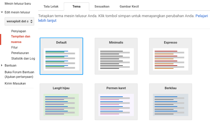 • Tampilan Dan Nuansa >> Sesuaikan , untuk kostumisasi tampilan dari kotak penelusuran, yaitu logo dan warna logo, warna tombol, warna garis dan background kotak penelusuran, warna font dari hasil penelusurannya.